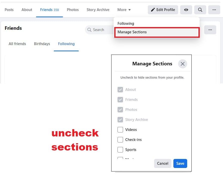 Now Facebook allows you to manage sections of your Profile as of what to remain visible while some, not. For example, you can hide check-ins, likes (liked pages), events, reviews given, groups and more.