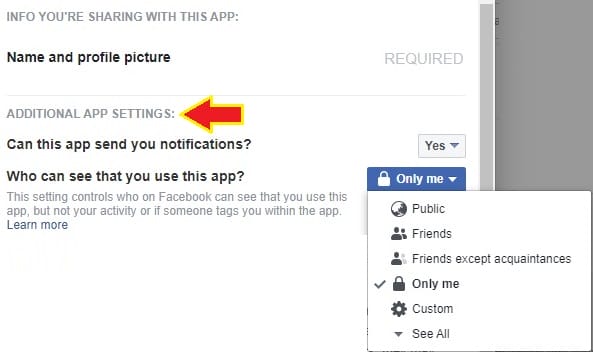 You can stop getting notifications from the app or control who can see you’re using this app. Same thing goes for Instant Games. Just in case you have older posts by old or outdated Facebook mobile apps, tweak the setting as below: