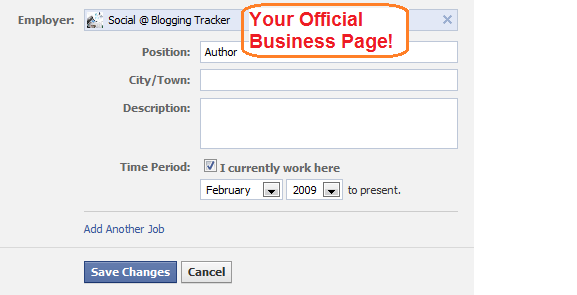 Now for the latest Facebook Timeline layout, adding your Facebook Page as the Workplace (or employer link) is easier than ever. Just go your Facebook profile’s ‘About’ section.